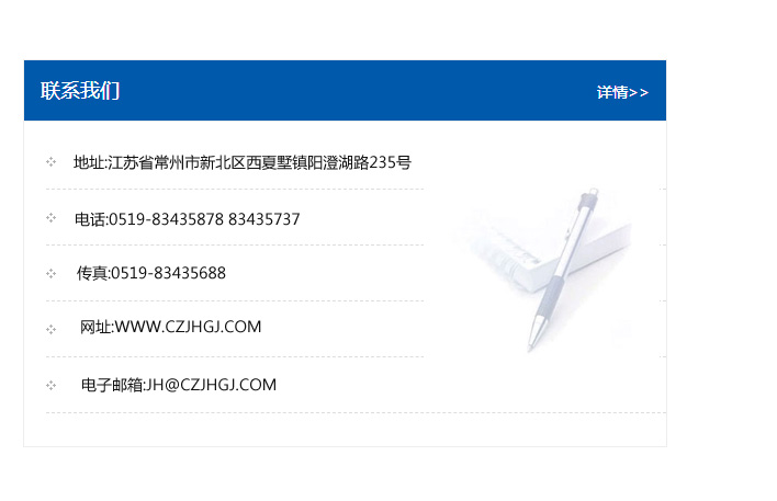地址:常州市新北區友邦商務大廈1幢16、17層  電話:0519-85101652  傳真:0519-85112595  郵編:213022  網址:www.cz-jiayue_cn.gzdrwgd.com  郵箱:xiajifengaa@163.com